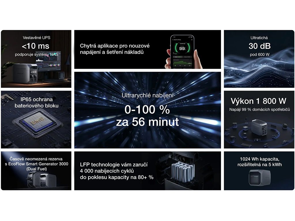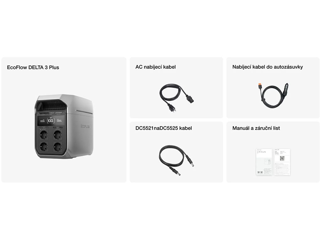 EcoFlow DELTA 3 Plus je bateriová stanice s akumulátorem LiFePO₄ a kapacitou 1024 Wh. Má několik výstupů, včetně standardních zásuvek střídavého proudu, portů USB-A, portů USB-C, 12V DC portů a portu pro přídavnou baterii, kterými lze napájet celou řadu spotřebičů a zařízení. Různé možnosti nabíjení umožňují využívat jednotlivé způsoby podle aktuálních potřeb. Stanice tedy představuje nejen velmi spolehlivý, ale zároveň i velmi flexibilní zdroj energie. Disponuje i velmi prostornou obrazovkou, která přehledně zobrazuje informace o jejím aktuálním provozu.