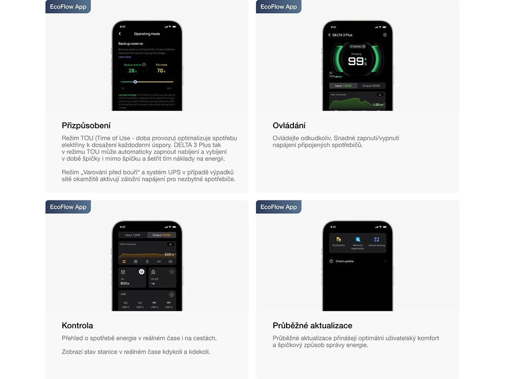 Provoz stanice lze prostřednictvím chytré mobilní aplikace EcoFlow sledovat a ovládat z jakéhokoliv místa s přístupem na internet.