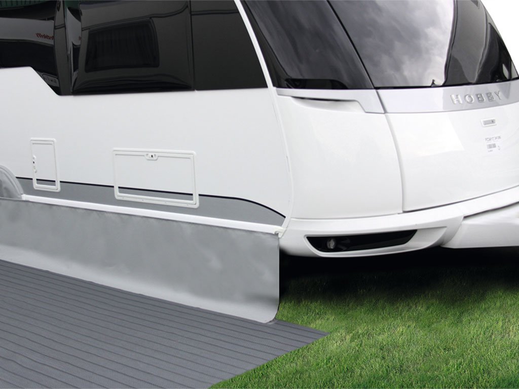 Šedá boční zástěna (Bodenschürze) o délce 500 cm je praktické příslušenství pro každý karavan a obytný vůz. Tato ochranná sukně se instaluje po obvodu vozidla mezi podvozek a zem a vytváří účinnou bariéru proti nepříznivým povětrnostním vlivům, prachu, sněhu a větru.